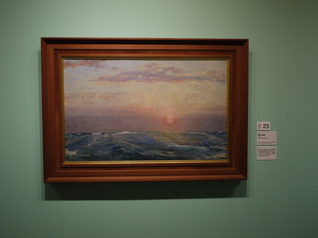 [/caption] デッサンの部屋から海の部屋、神話をモチーフにした部屋、意識して文展風の作品が描かれた部屋、そして絶筆の部屋へ。ゆったりと歩いていくと、青木の短いながら濃密な生き様が立ち現れてくる。 [caption id="attachment_712" align="alignnone" width="460" caption="絶筆となった「朝日」"]