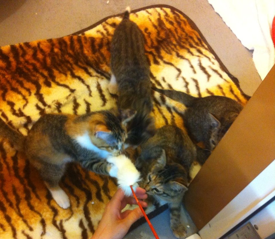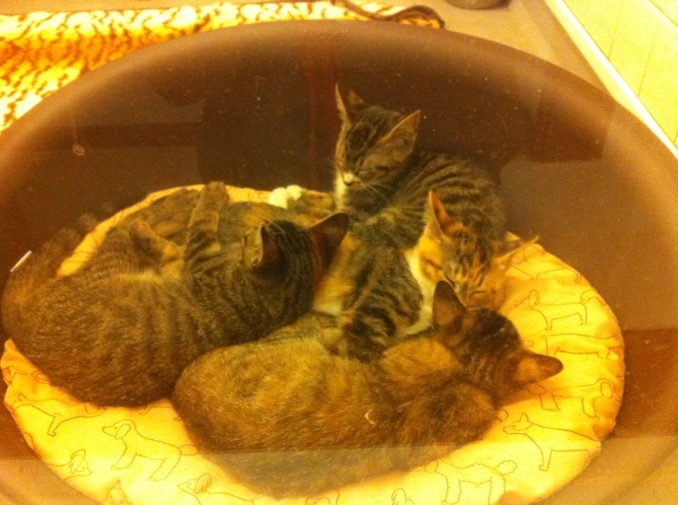 子猫ちゃんたち☆ 2015.10.16 09:10 只今里親さん探し中の子猫4匹です😊 →全て優しい里親さんが決まりました! 昼間にお店の中をドタバタ走りまわり、疲れたようで4人で仲良くくっついて寝ていました😴 とっても元気な4匹です💓 気になる方は是非お声がけ下さい😊💕