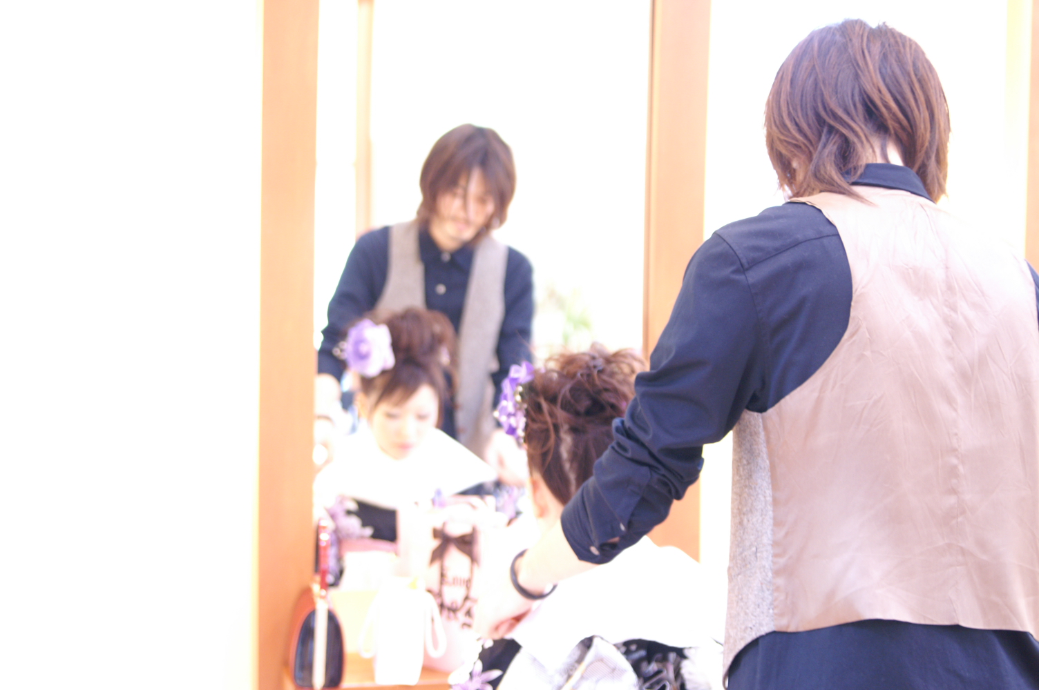 遅ればせながら13日は成人式でした。 朝4時からスタート。今年はほとんどの方がセットメイク着付けとフルコースでした。 やはり着物っていいですね。本当に日本人て・・・日本の文化って素敵だなと思います。着物姿を見ているだけで幸せな気分になります。 日本に生まれてよかったなと思います。 この写真はマインズに4月からスタッフとして参加する石黒さんです。芯のしっかりした明るい子ですので皆さ んよろしくお願いいたします。