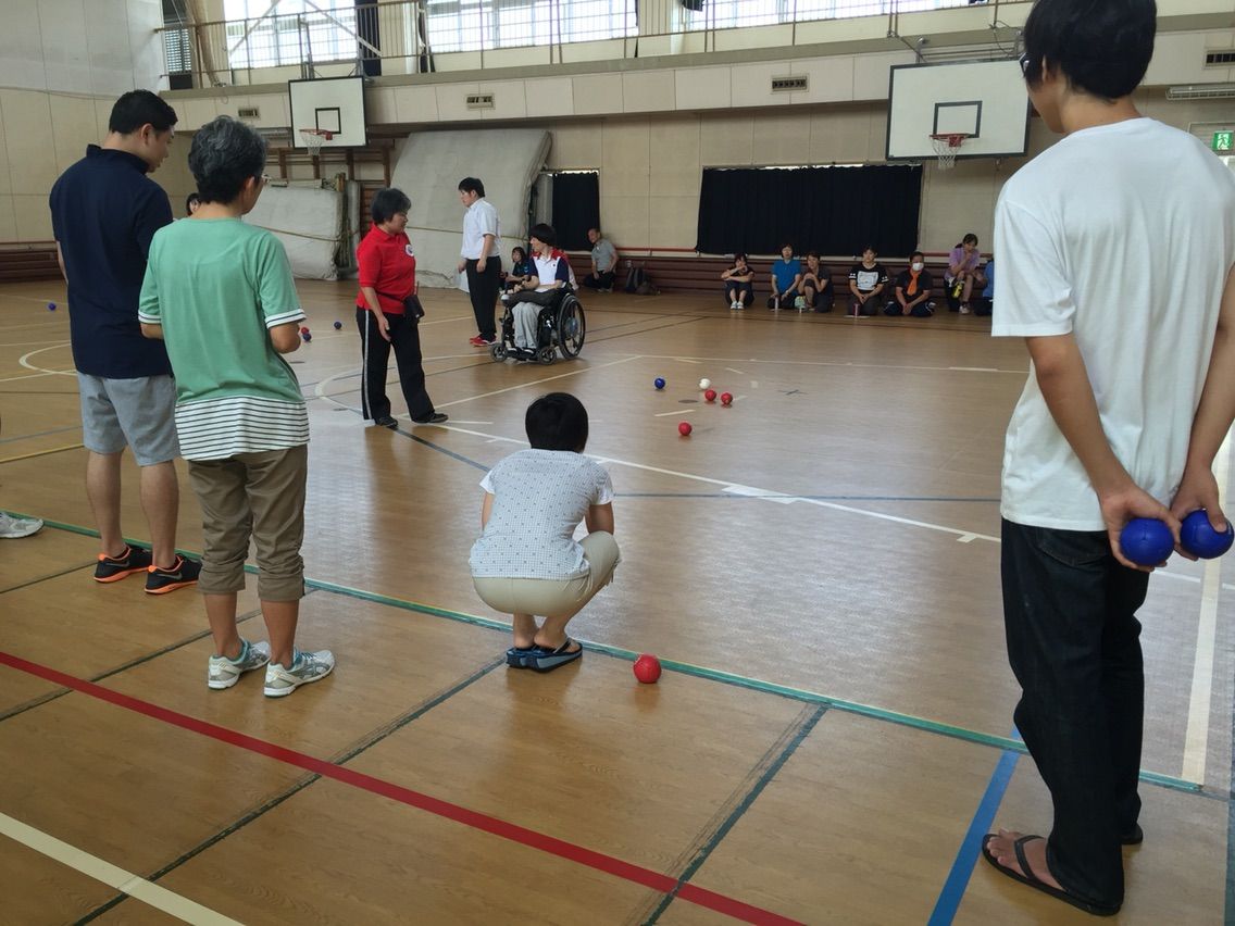 同じ埼玉ボッチャクラブの仲間と一緒に行い、ミニ講演後は仲間とのボッチャ対決、その後に教員の皆さんにボッチャを体験してもらいました。
