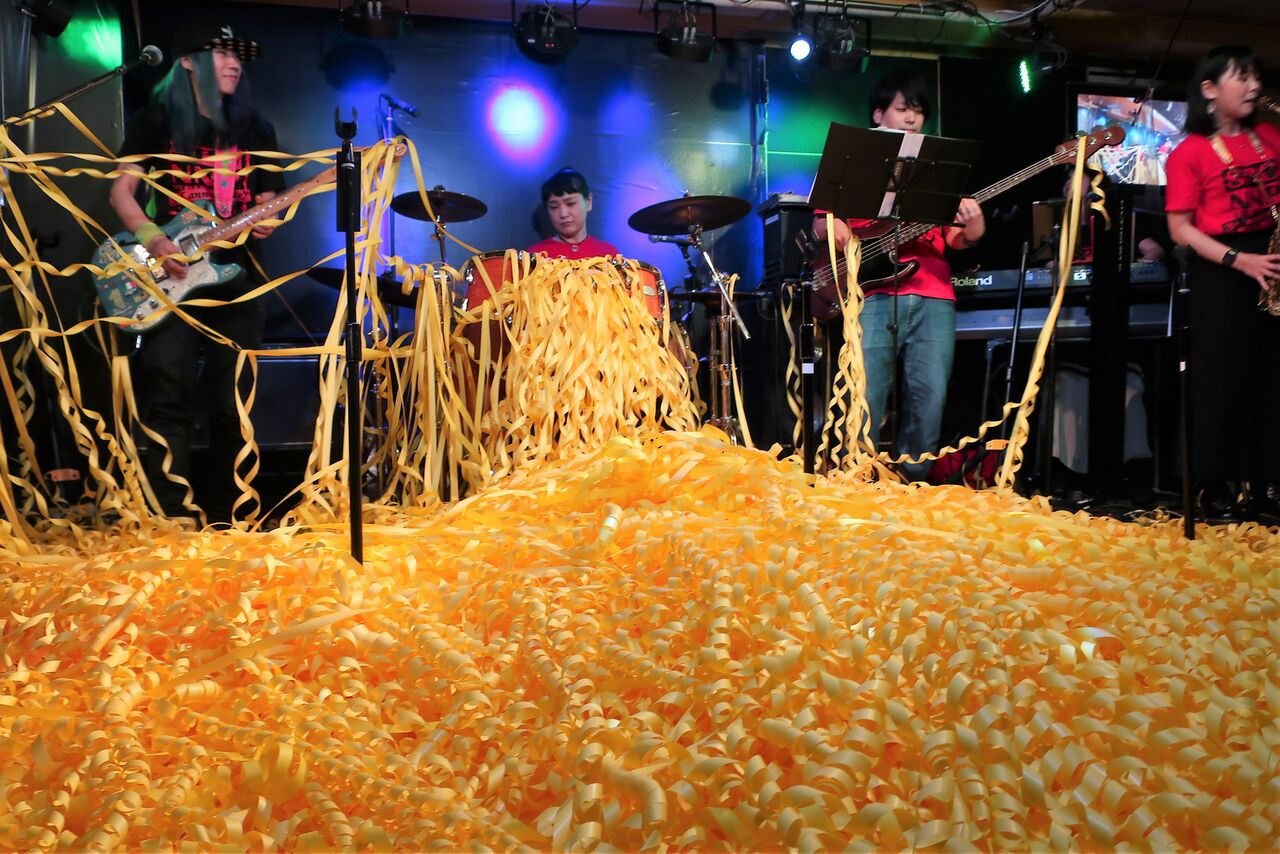 紙テープ芸人たちの宣言どおり、ゴンガーシホさんを超ムカつかせ、センナさんのドラムセットを「金色の野」に沈めました。恐るべし、紙テープ芸人たち。