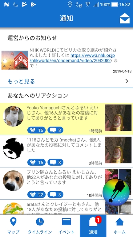 3.通知画面:1画面でお知らせとリアクションをまとめて見られるようになります。