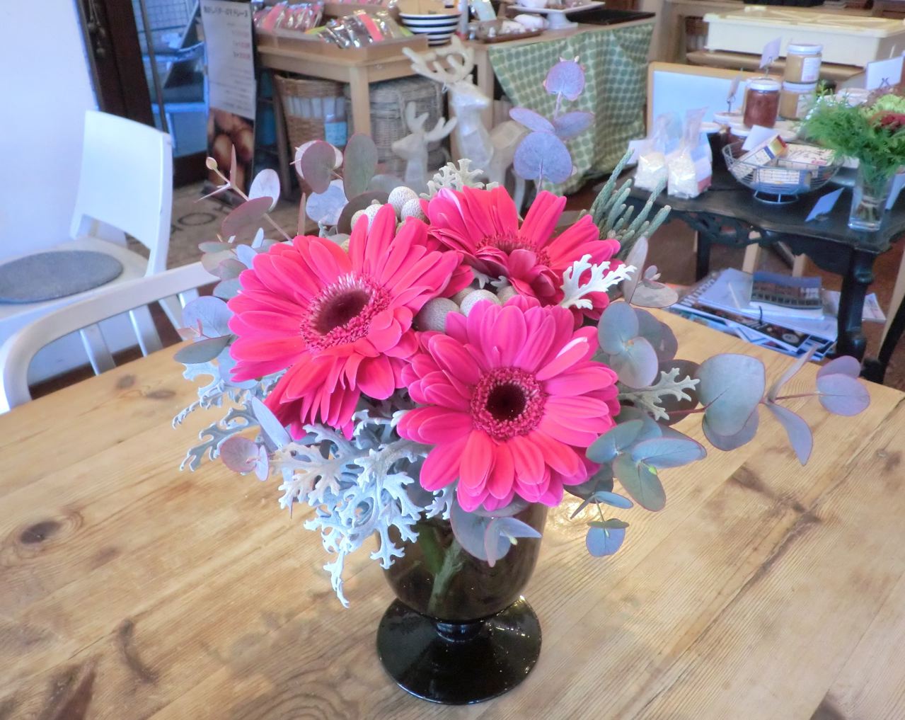 」さんの生け込みです。大輪のガーベラ(ジョルジオ)、シルバーブルニア、シロタエギク、ユーカリで。