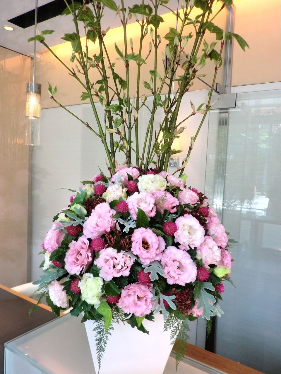 」さんの生け込みです。トルコキキョウ、センニチコウ・ストロベリーをメインに。