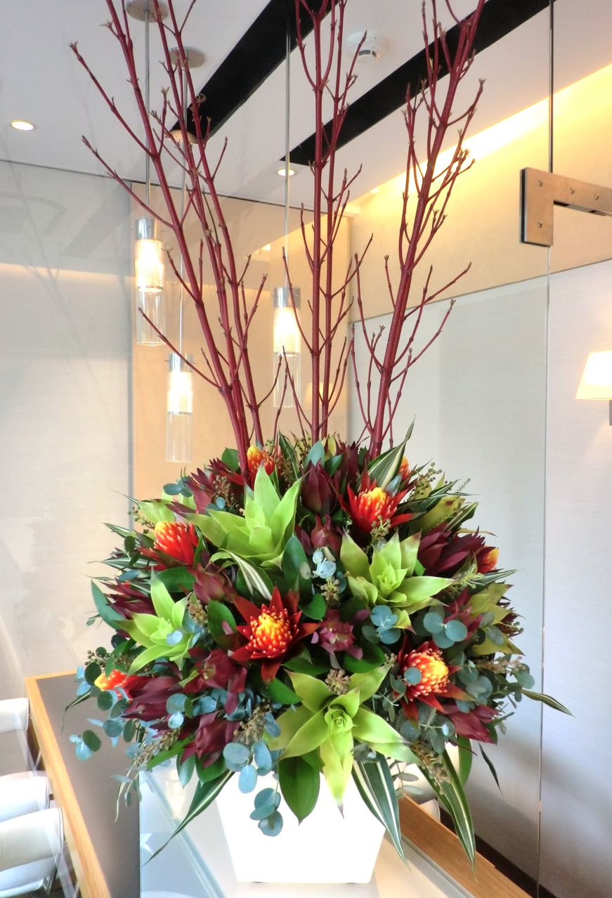 」さんの生け込みです。グズマニア・マグニヒカ、リューカデンドロンをメインに。