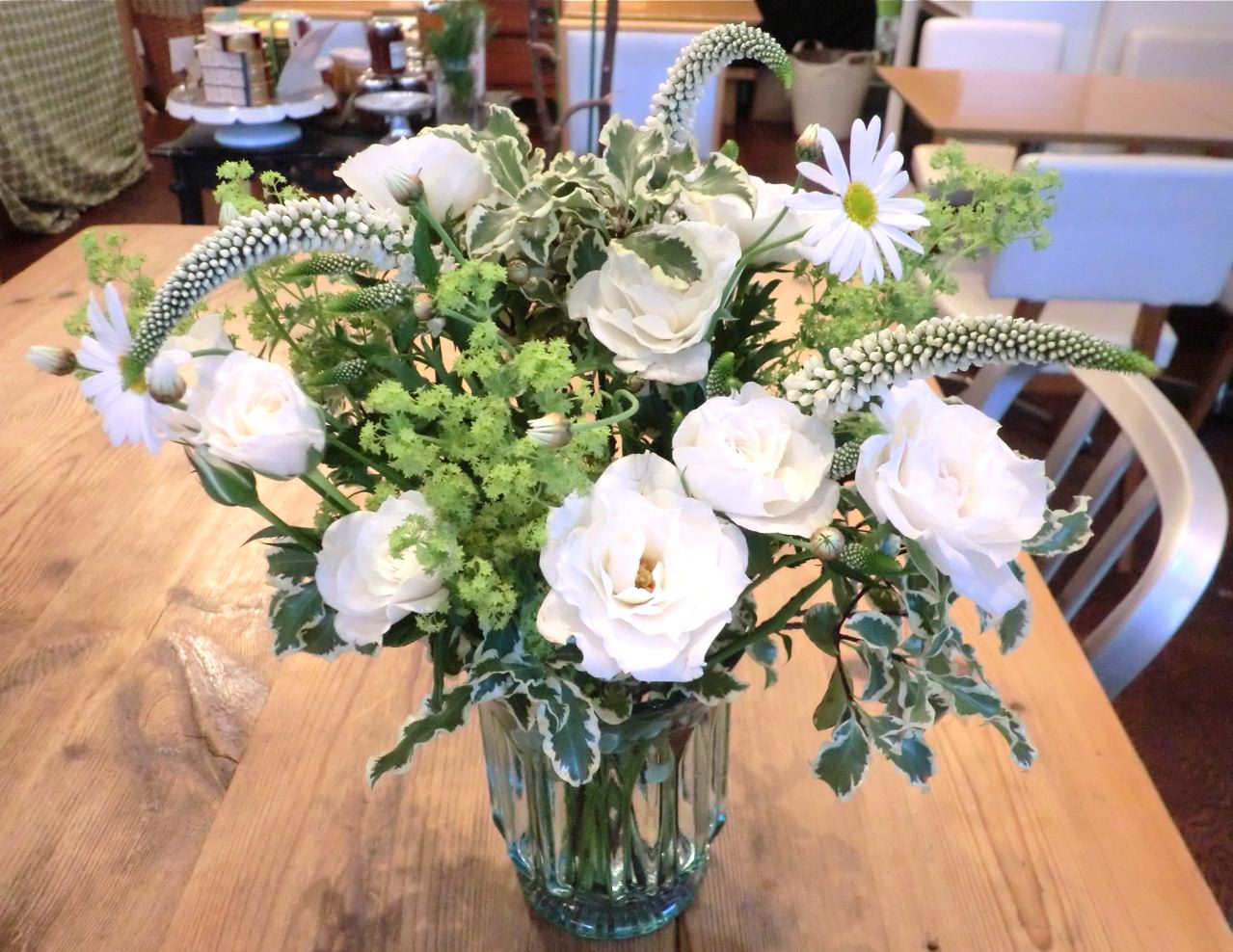 」さんの生け込みです。バラ(プリンセス)、ベロニカ、マーガレット、アルケミラ、ピットスホルムで。