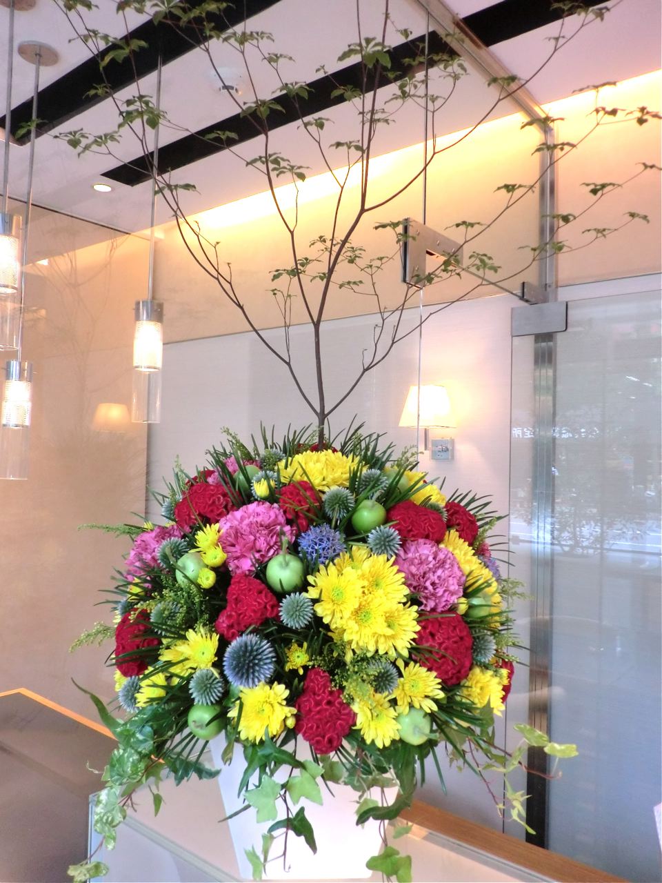 歯科医院の生け込みです(横浜市中区) 2014.06.22 23:38 関内本町通りハローワーク向かいの「山口歯科医院 」さんの生け込みです。ケイトウ、SPマム、瑠璃玉アザミ、カーネーション、青リンゴ、ソリダゴ、アイビー、マキ、ドウダンツツジで。