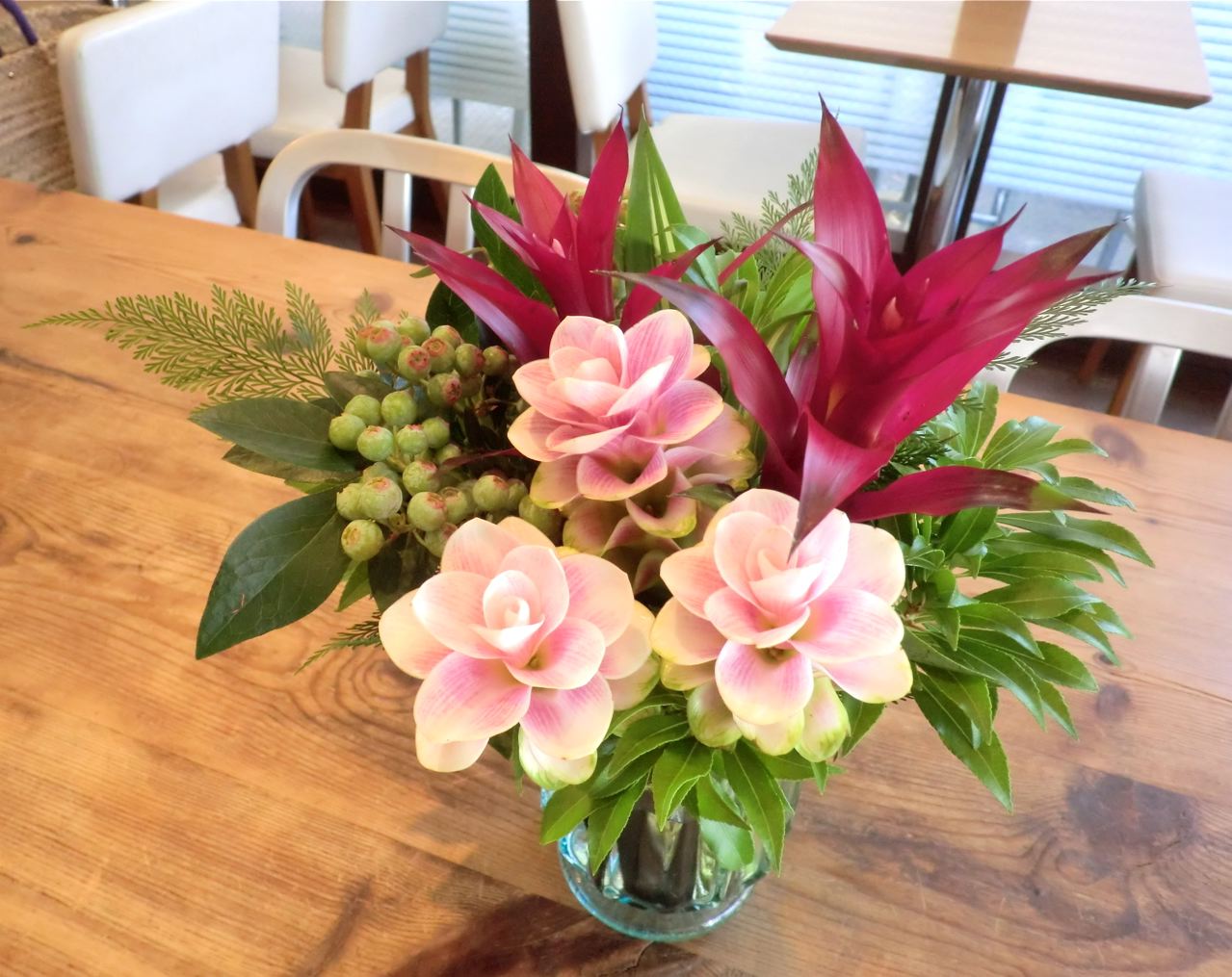 」さんの生け込みです。クルクマ、グズマニア・マグニヒカ、ブルーベリーの実、タバリアファン、アセビで。