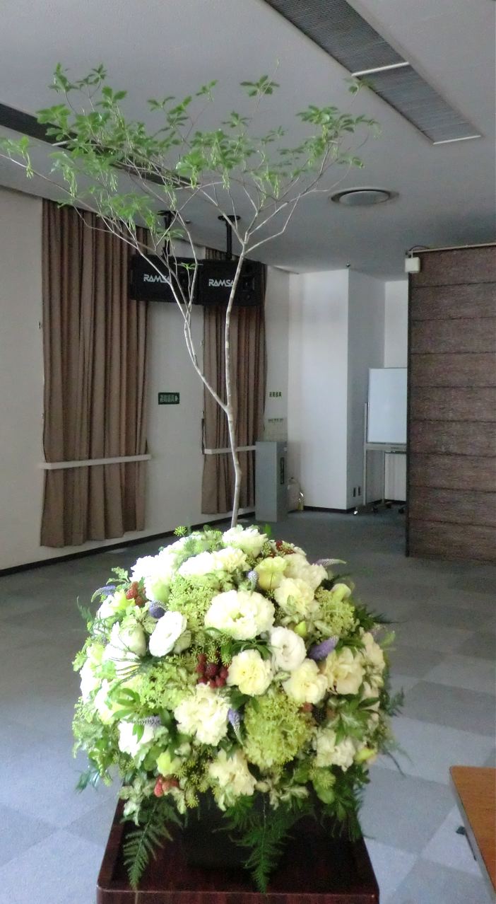 記者会見の壇上の装花です。神奈川県民ホール会議室にて。