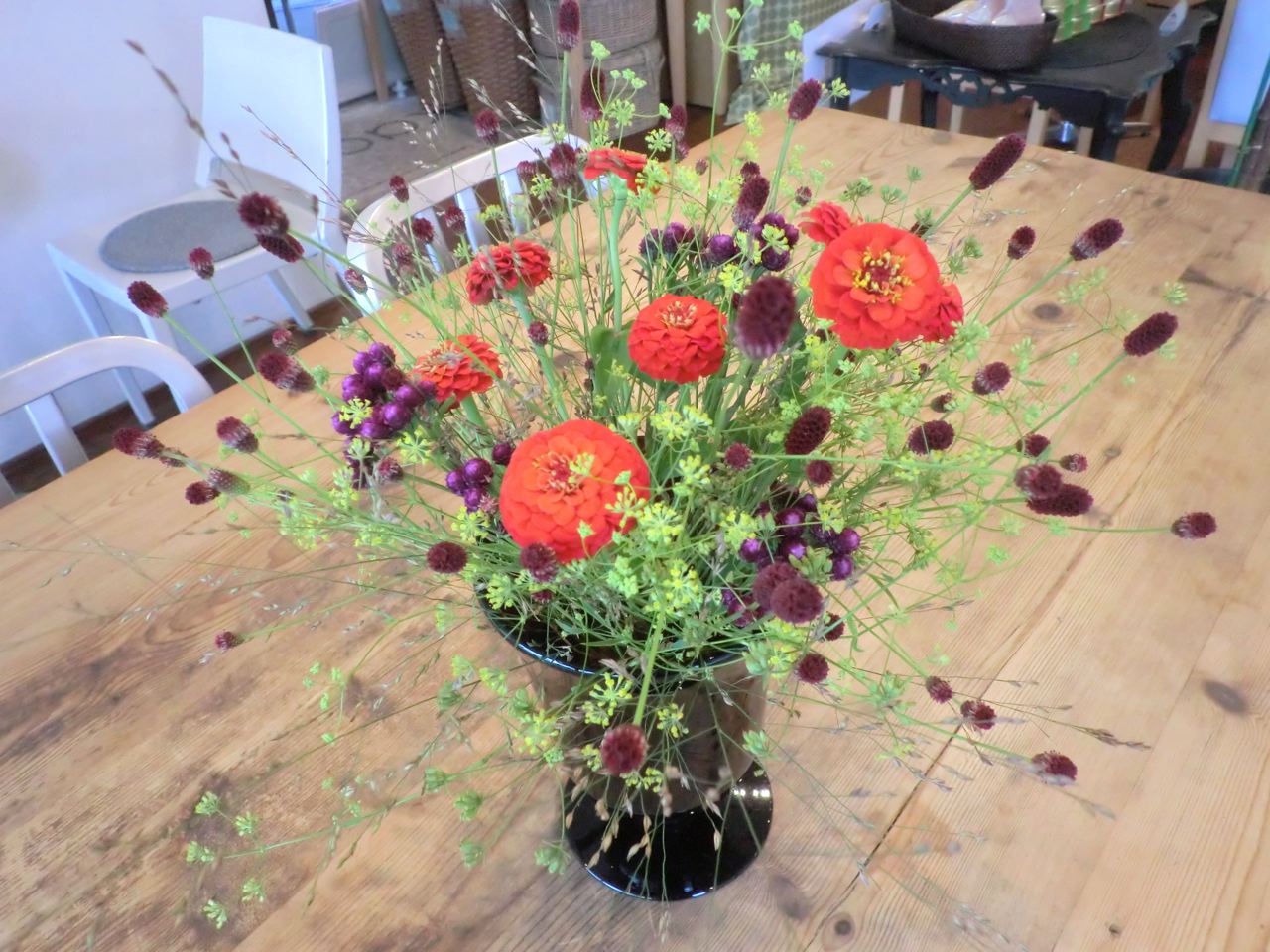 」さんの生け込みです。今回はジニア、ヒメヒゴダイ、ミシマサイコ、ワレモコウで。