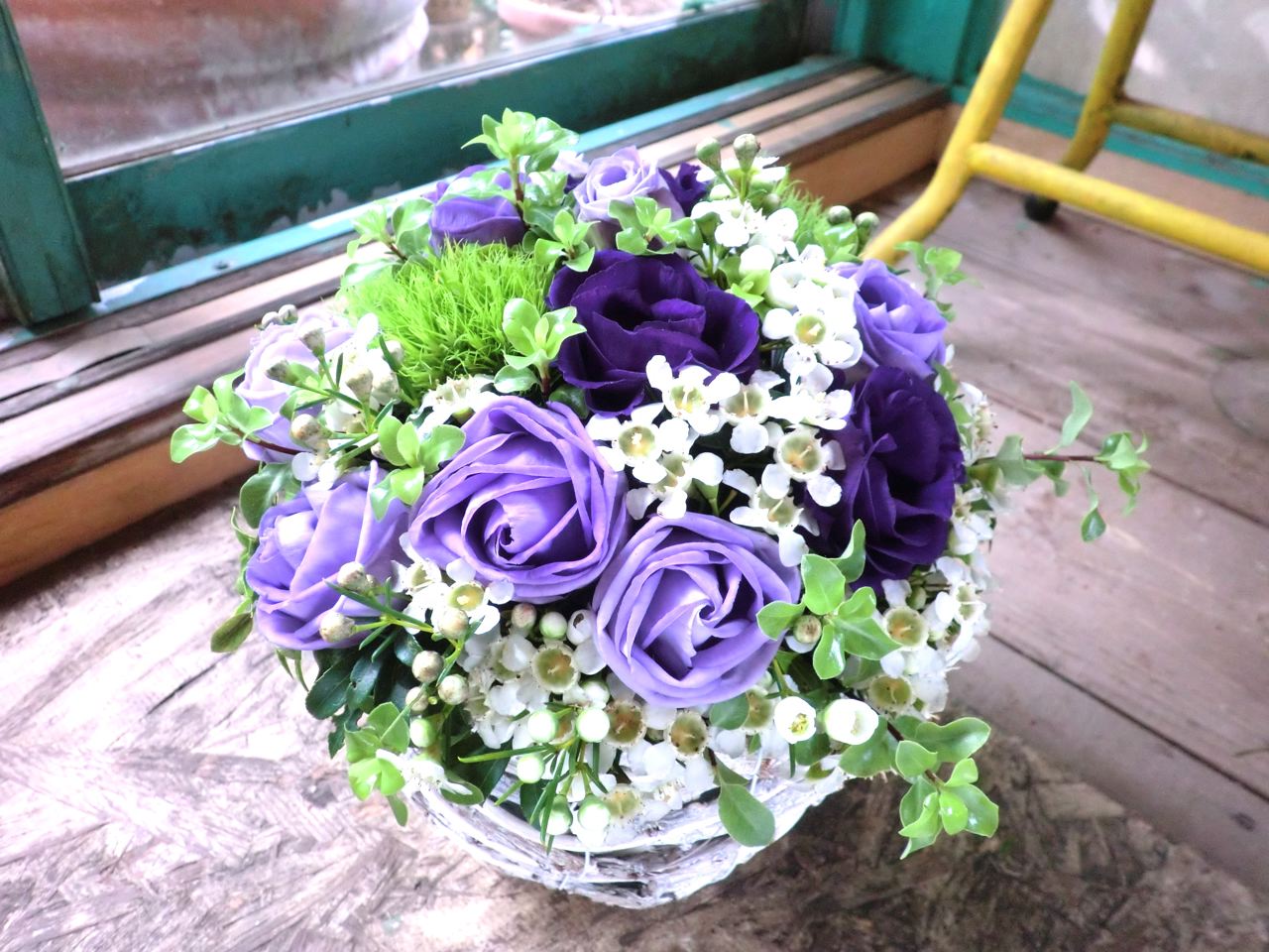 トルコキキョウ、ワックスフラワー、手まり草などで。