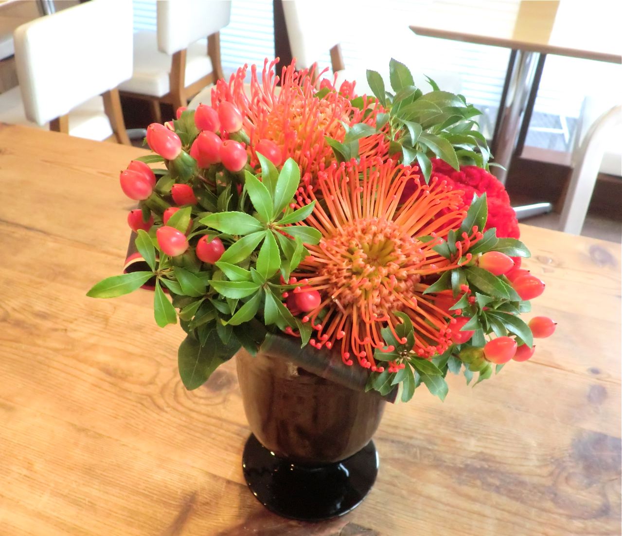 」さんの生け込みです。ピンクッション、ケイトウ、ヒペリカム、アセビで。