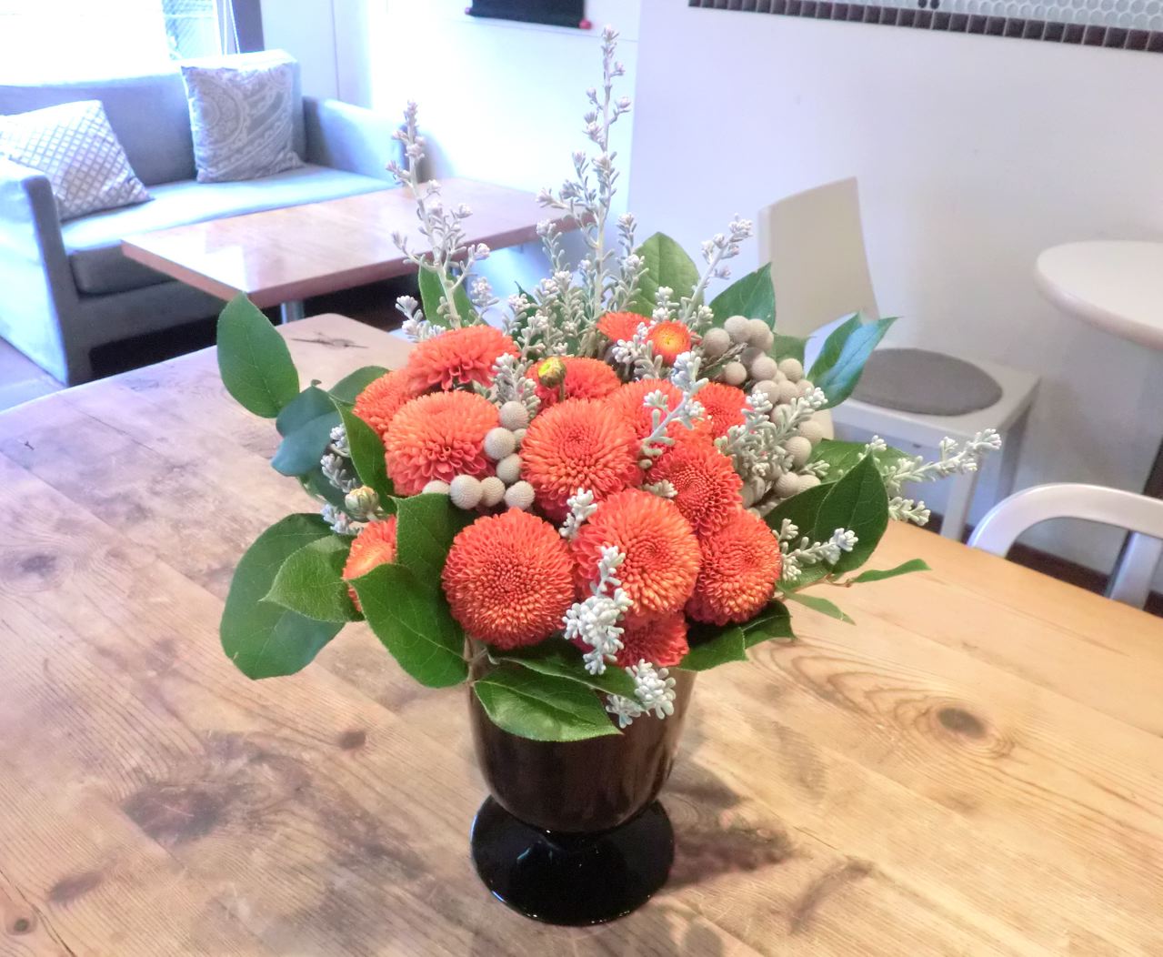 」さんの生け込みです。SPマム(マロン)、コチア、シルバーブルニアなど。