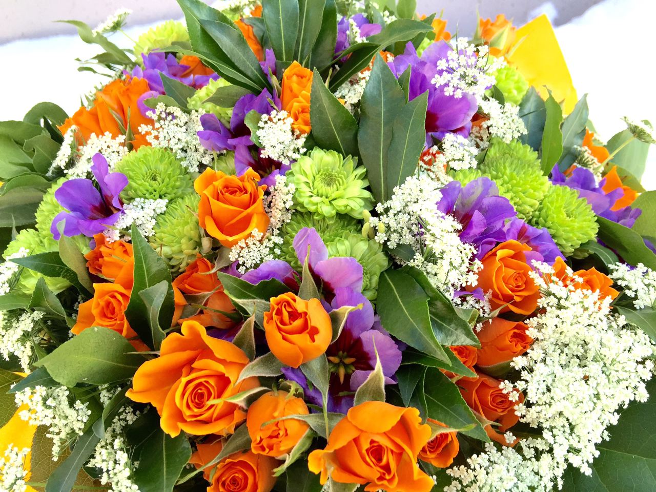 お誕生日の花束。オレンジ系。アクセントにリューココリーネの青を入れてみました。