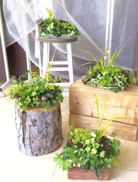 花材の半分ほどは美流渡の森のもの。やっぱり出来上がった作品は小さな森のようです。北海道岩見沢市「カルペディエム」さんにて。