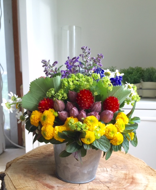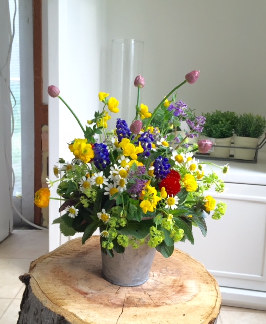 フラワーレッスン。生徒さんの作品です。 2015.05.30 00:59 今回の美流渡の森の花材はチャイブの花、都草、キャットミント。その他は札幌の花市場から。かなりビビットな色合いのアレンジが出来ました。岩見沢市「カルペディエム」さんにて。