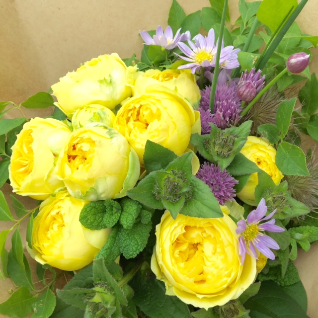 美流渡の森 花の直送便 2015.06.13 01:38 カンガルーファクトリーの庭から収穫した無農薬、摘みたてのお花の直送便。少しずつ自家栽培のお花を増やしていく予定です。美流渡産の花材 チャイブの花、ミント、ベルガモット、オキナグサの実、ミヤコワスレ。メインのバラは札幌花市場より。今回は送料、消費税込み4000円です。
