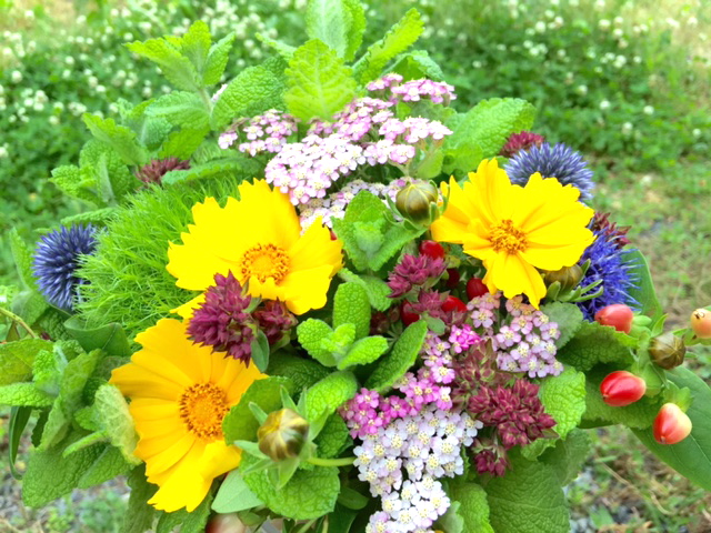 美流渡の森 花の直送便 2015.07.06 23:50 カンガルーファクトリーの庭から収穫した無農薬、摘みたてのお花の直送便。美流渡の森の花材はミント、オレガノ、アキレア、へレニウム。瑠璃玉アザミ、手まり草は札幌花市場で。今回は3000円(送料、消費税込み)です。