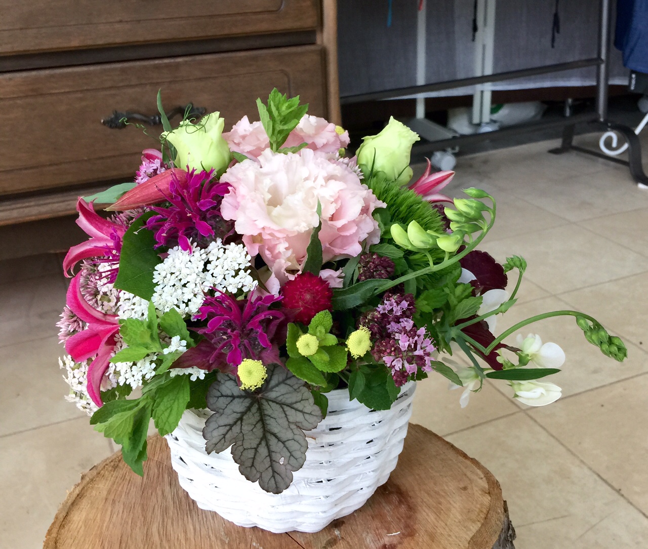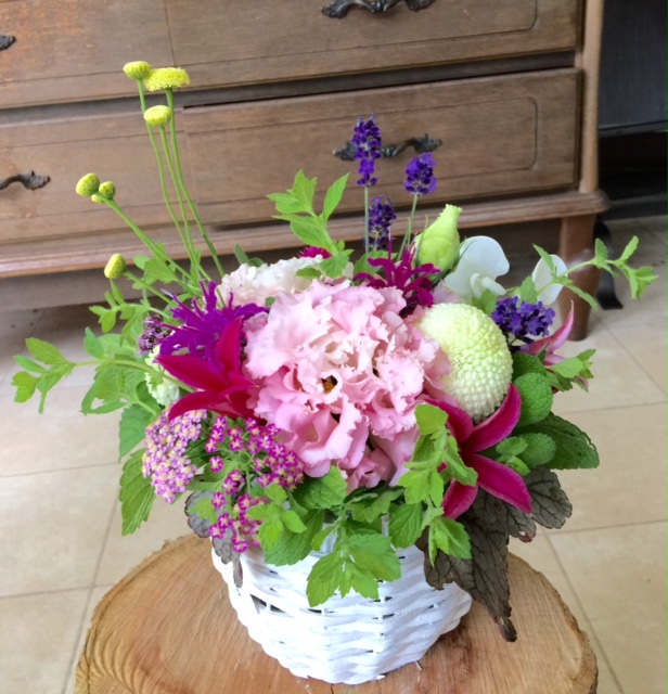 フラワーレッスン。生徒さんの作品です。 2015.07.18 01:54 美流渡産の花材はクレマチス、ラベンダー、サマースイートピー、ベルガモット、オレガノ、ペパーミント。トルコキキョウは札幌花市場より。