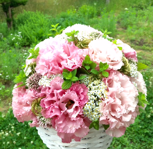 ご仏前のアレンジメントです 2015.07.22 01:21 トルコキキョウをメインにアキレア、フジバカマ、レモンバーム、クレマチスの実で。クレマチスの実は今朝庭を散歩していて見つけました。ちょっと嬉しい発見。