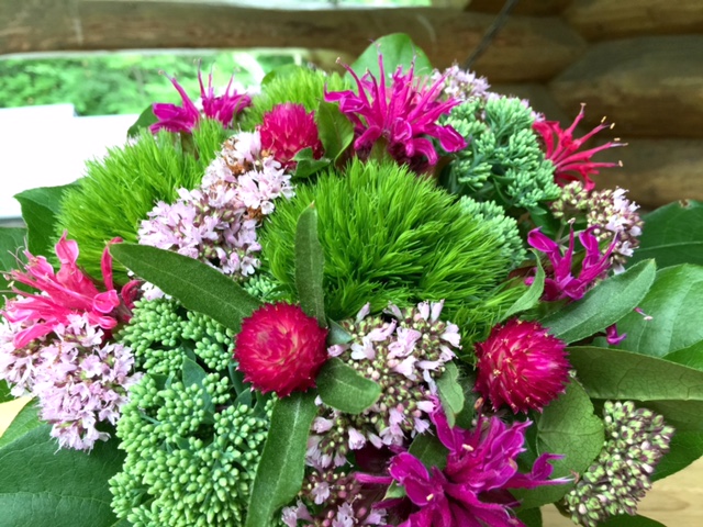 」さん受付花です。今回の花材はベルガモット、千日紅、手まり草、セダム、オレガノ、レモンリーフ。