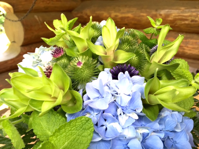 」さん受付花です。クルクマ、アジサイをメインに。
