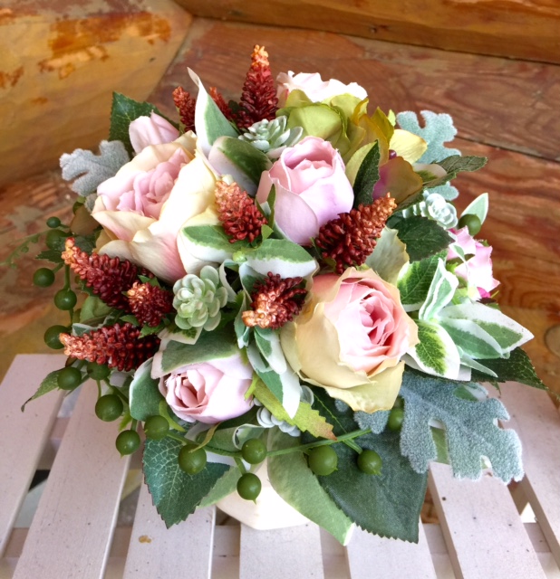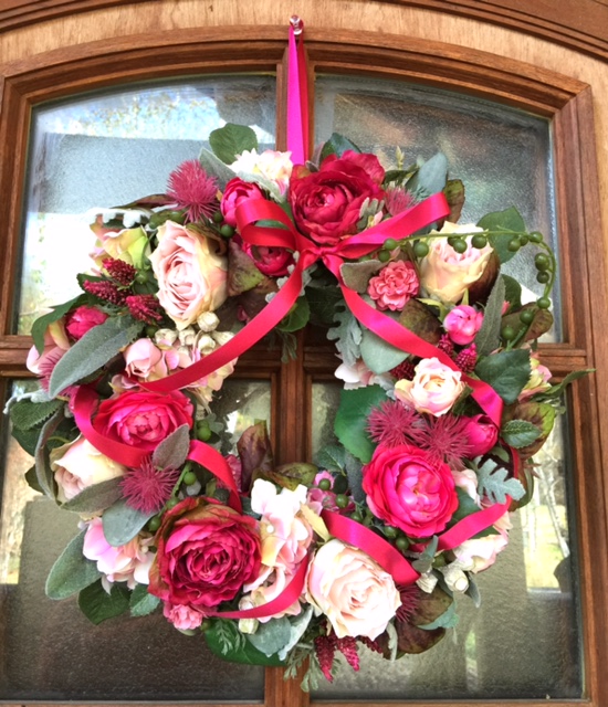 アーティフィシャル・フラワーで壁掛けのリースと置物のアレンジメントを作りました。内装に合わせてピンク系で。