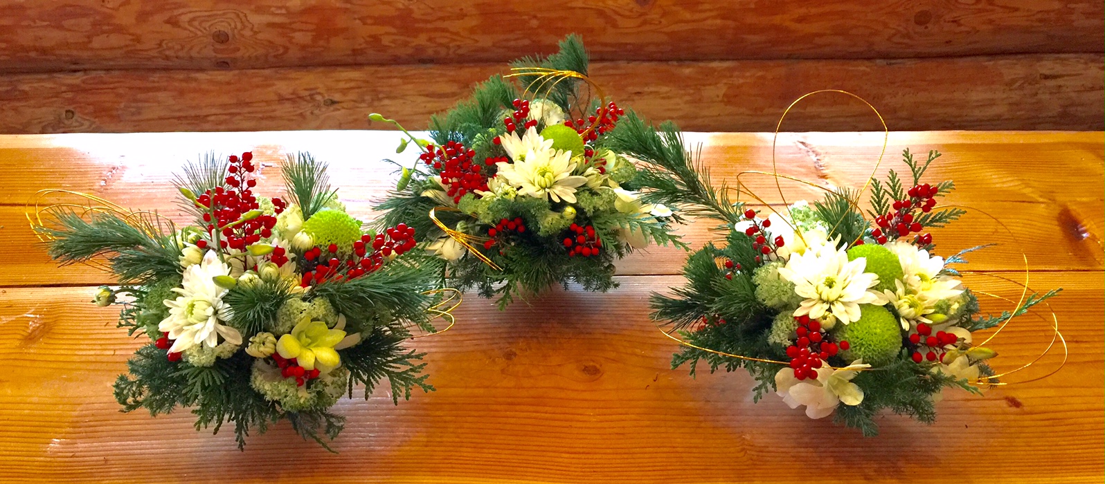 お正月アレンジ。三者三様ミズヒキの使い方が個性的でした。