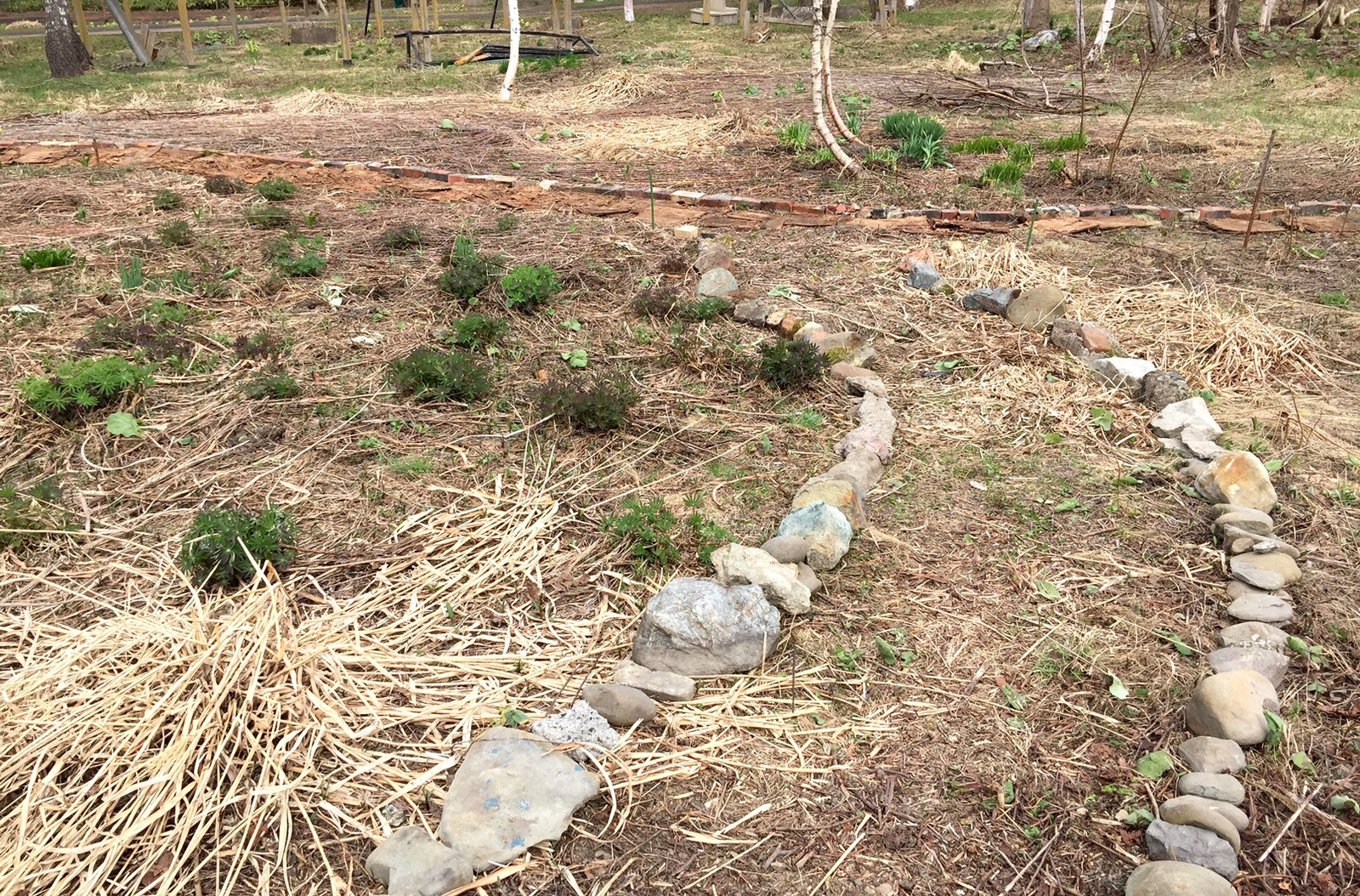 ガーデン日記 2 2016.04.27 23:45 道づくりまだやってます。細い道は土の中から出てきた石ころで作りました。地味な作業ですがやった成果が見えるのが救いです。ところで写真の左側にある植物はルピナスの新芽。これは元々あったものなのですが、去年はいろいろ可愛がったのでずいぶん増えていました。移植したり周りの雑草を抜いたり種を蒔いたり…。こういうのを見つけると嬉しいです!(m)