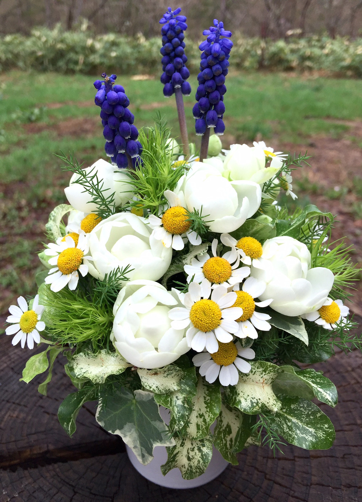 庭でムスカリが咲き始めました。美流渡のブルーに白のスプレーバラを合わせて潔く。(y)