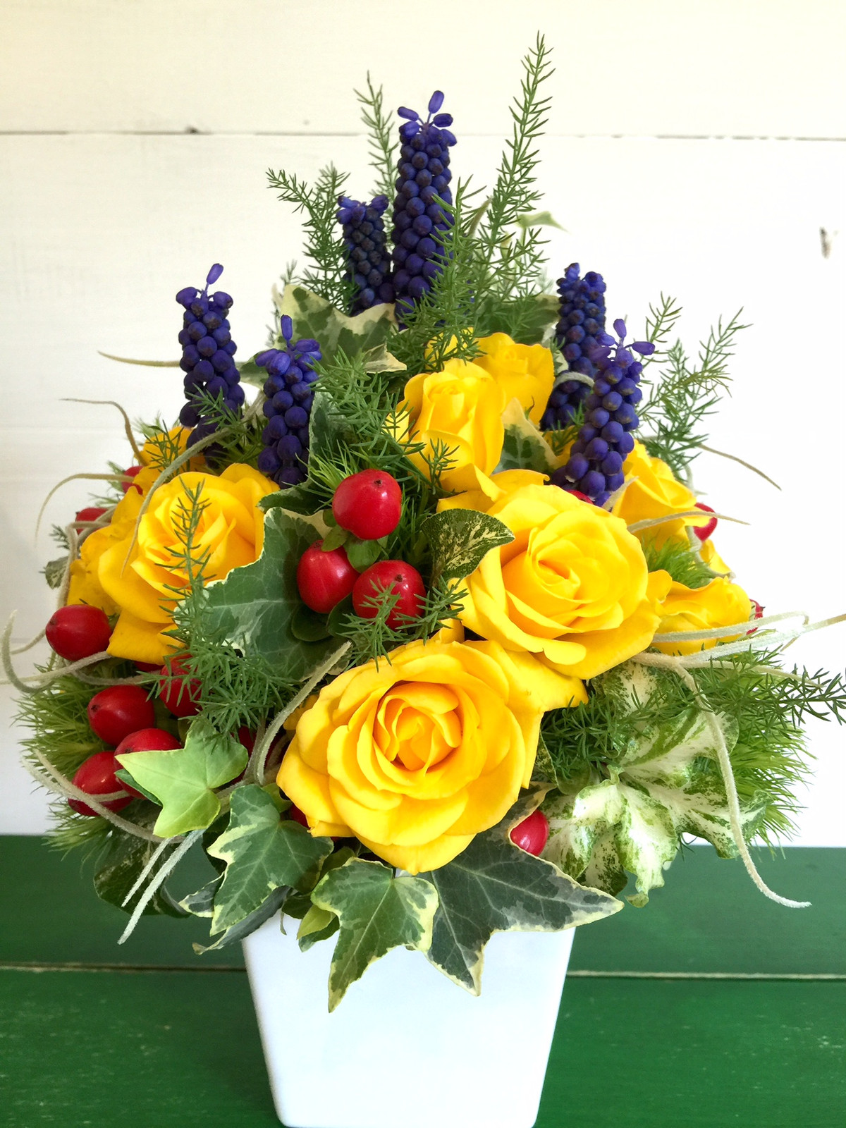 カンガルーファクトリーのガーデンからムスカリを収穫。黄色のバラと合わせて陽気に仕上げました。(y)