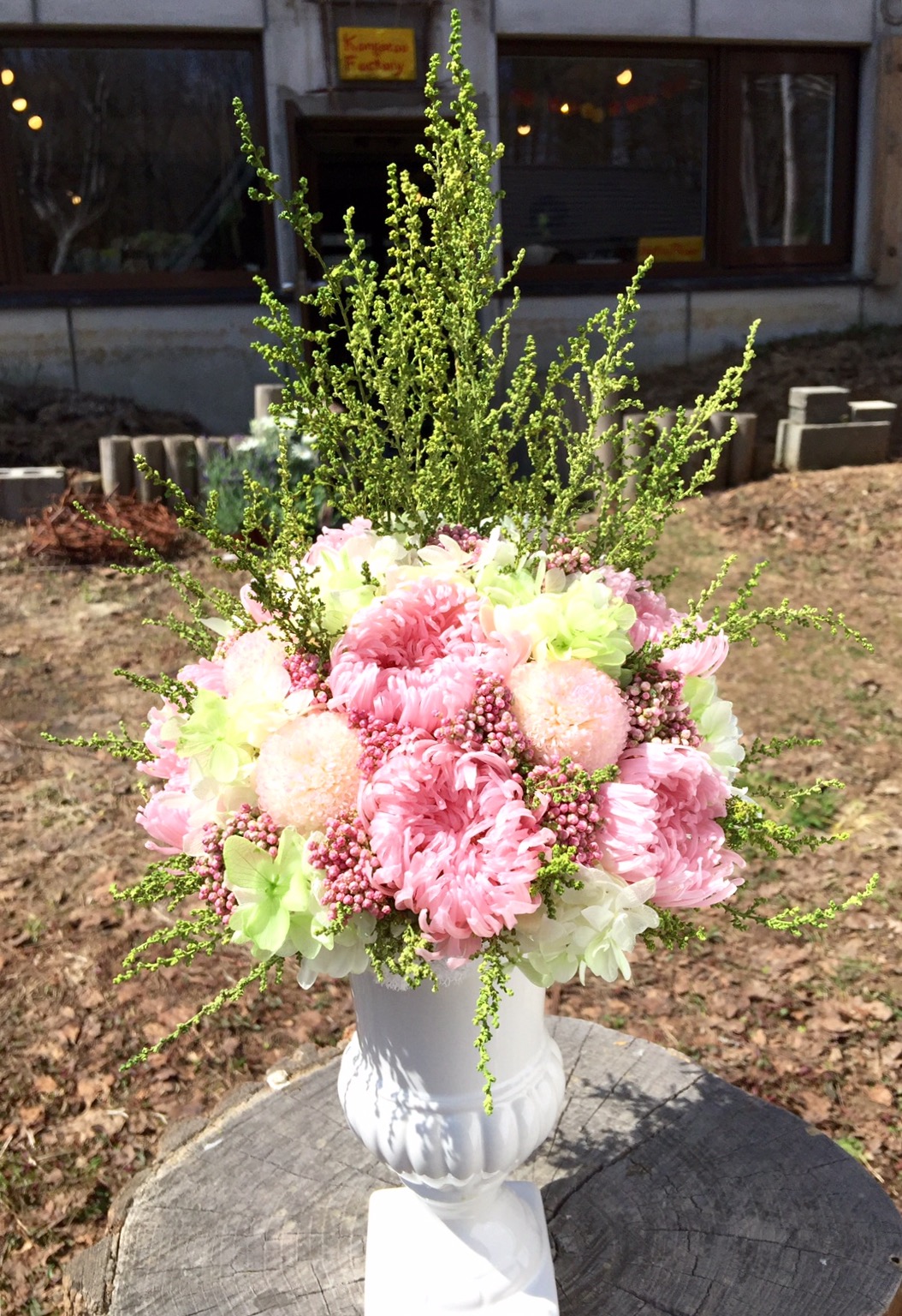 アナスタシアとピンポン、2種のマムを入れて優しい色合いに