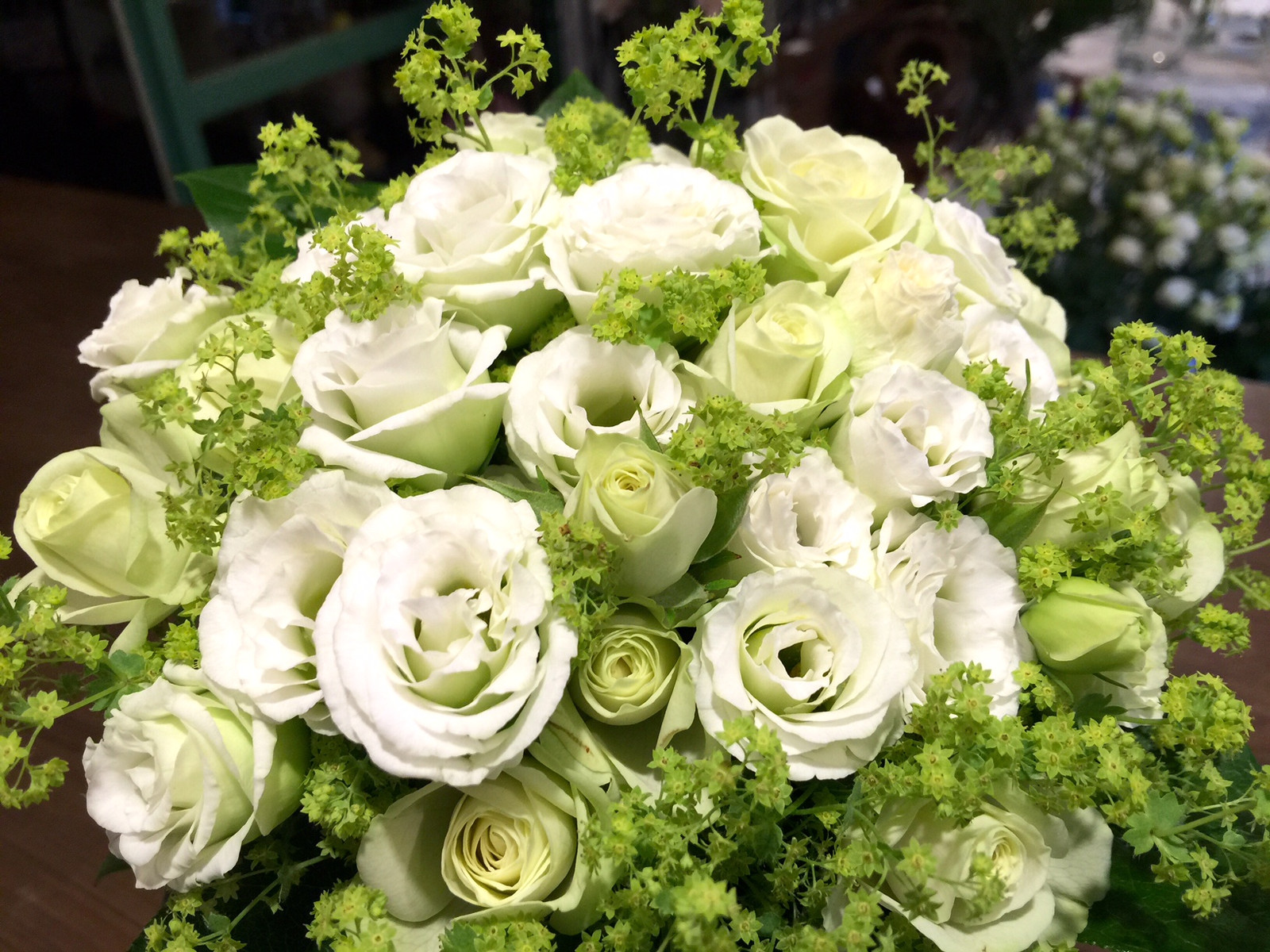 小輪咲きのトルコキキョウとグリーンのスプレーバラをアルケミラでまとめました。爽やかなイメージで。(y)