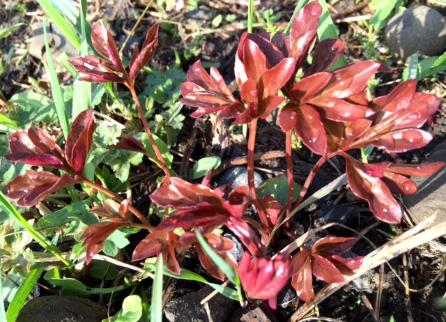 「シャクヤク」 前から庭にいたもの。各地に散っていたので一箇所にまとめました。もっと大きくしたいので今年は鑑賞のみ。