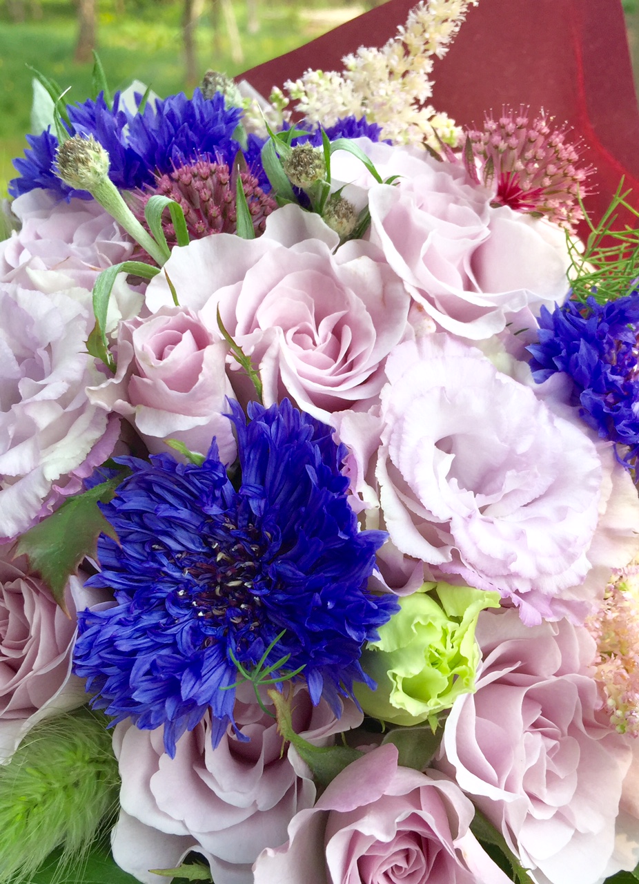 ヤグルマギクを使ったムラサキ系のブーケです。(y)