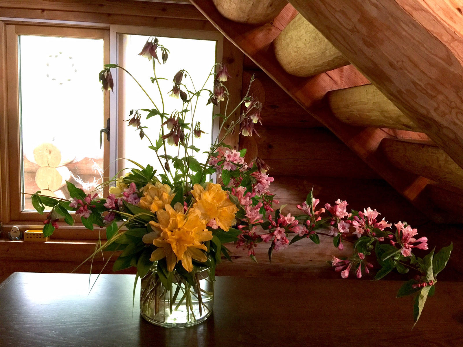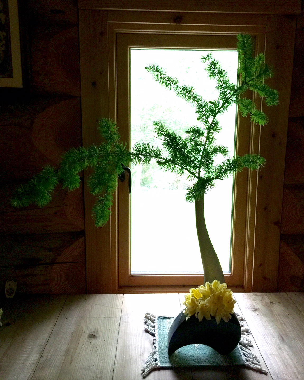 美流渡の森山荘 生け込み 2016.06.01 22:51 山荘の周りで採取した花たちを活けました。アルテ・ポーヴェラの実践開始。ピンクの花の谷空木、ツツジ、オダマキ、風知草、アルストロメリアの葉。もう一つはカラマツとツツジ。カラマツは今新緑真っ盛りです。(y)