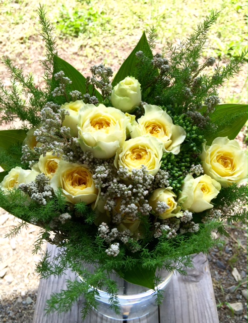 自家栽培の花はブーケの周りに添えたギボシの葉。