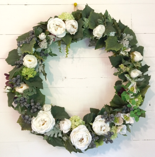 白い花をメインに数種のグリーンと実物を入れて(直径50㎝)。
