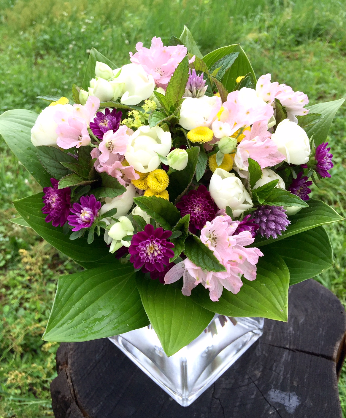 今回のガーデンのお花はチャイブ、アルケミラ、ブラックミント、ギボシの葉。