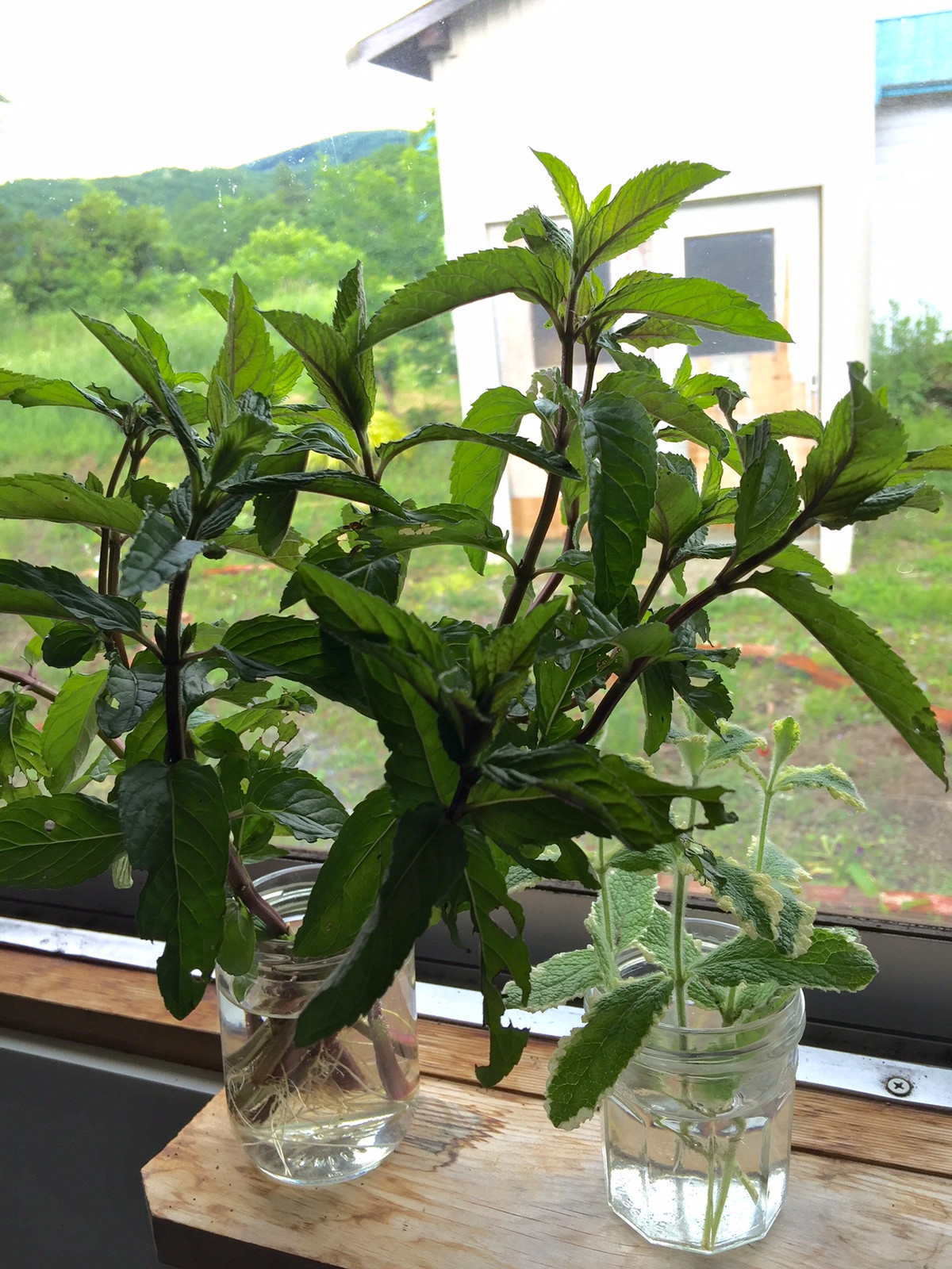 窓辺に飾ったミントは発根したらガーデンに植えています。(m)