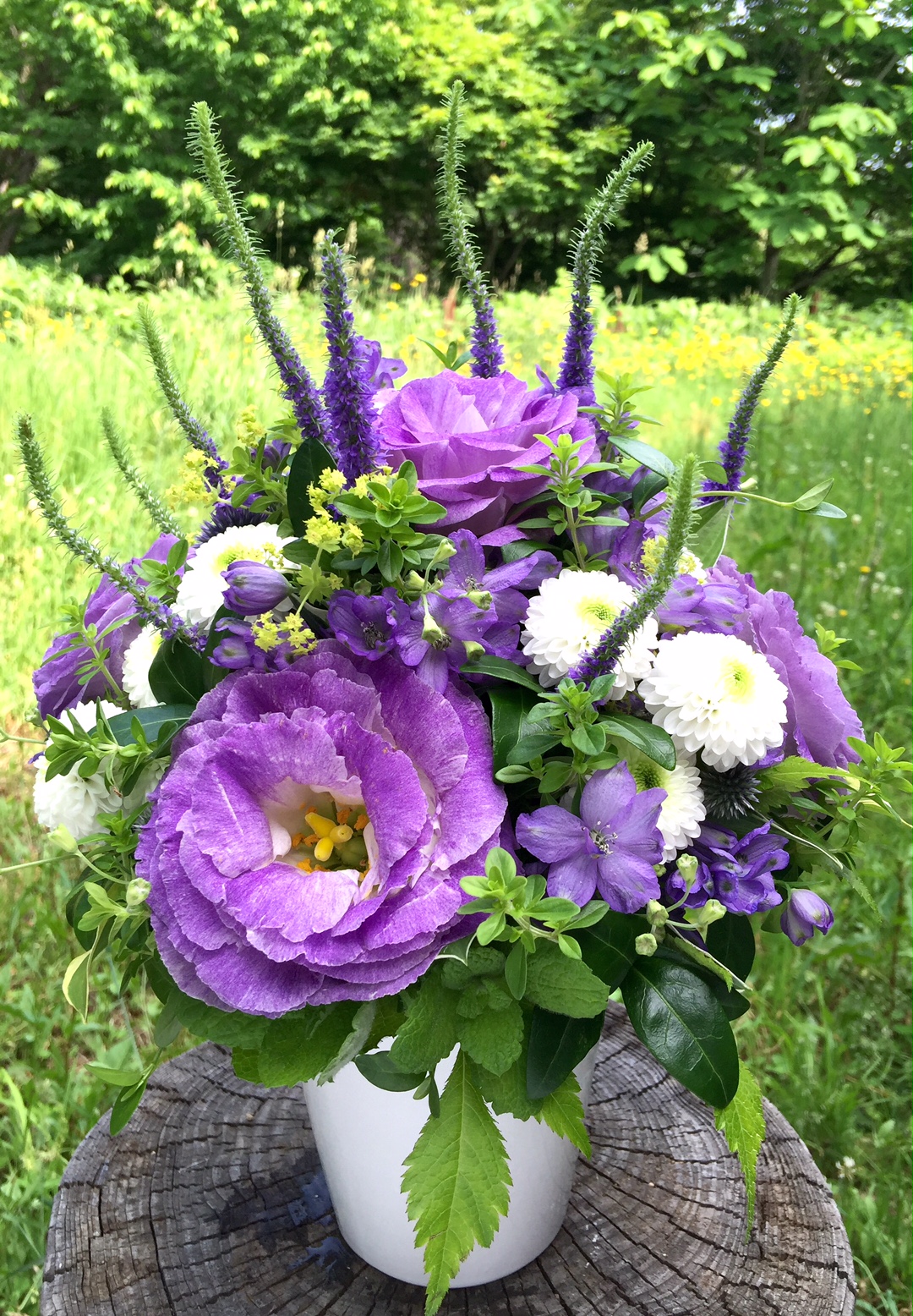 初夏の柔らかいグリーンを入れて、紫色をメインに作りました。ベースグリーンは全てガーデンから。(y)