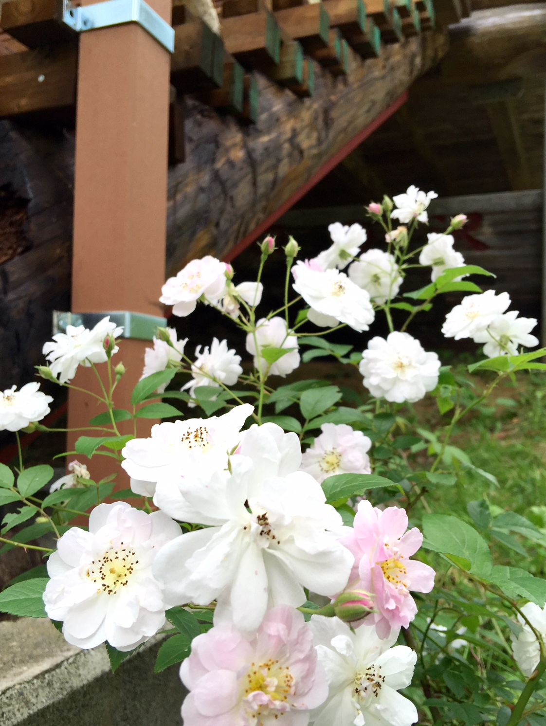 「美流渡の森山荘」のエントランスに植えた蔓バラ(ポールズヒマラヤンムスク)が満開になりました。2階のテラスまで蔓が伸びたらいいな。(m)