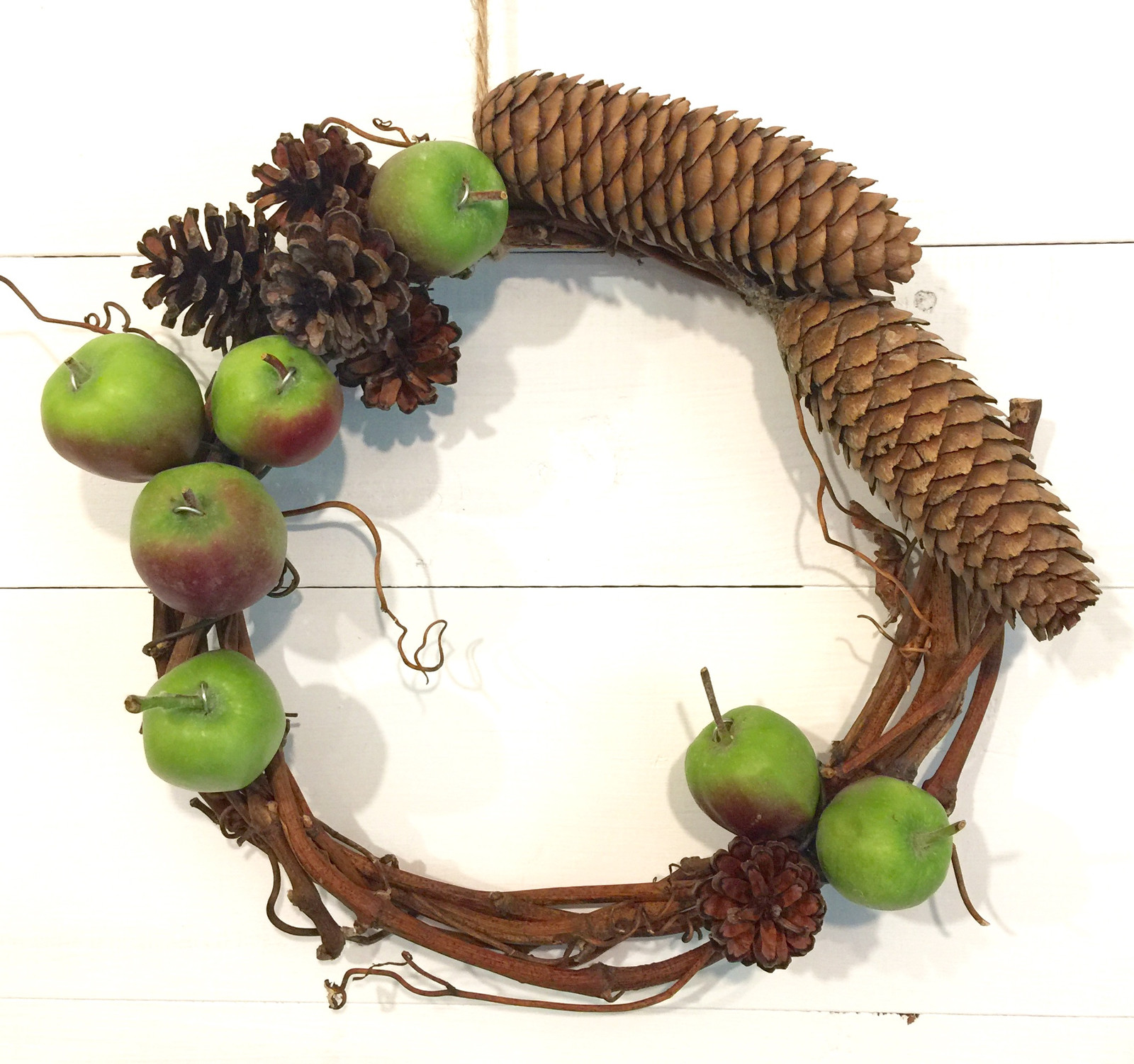 今、果樹園のりんごの実は瑞々しい緑色の子供達です。間引いた実を使って森のリースに色付けしました。(y)