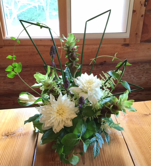フラワーレッスン生徒さんの作品です 2016.07.21 00:05 大きなメインフラワーはダリア。花首の向きを選ぶのが難しいところです。ユニークなフトイとツルニチニチソウの演出で涼しげなアレンジメントに仕上がりました。(y)