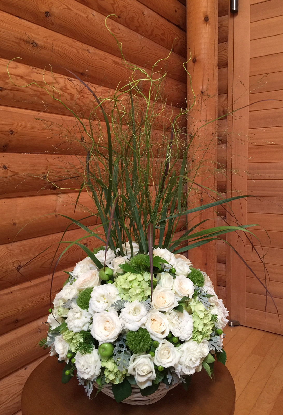 ブライダル装花 2016.07.29 23:51 青りんごは近所の農家さんから頂きました。旬の素材は最高の贈り物。美流渡のミントを贅沢に入れて香りと果実の入った季節のブライダルブーケです。(y) 大きなアレンジメントは食事会や写真撮影のデコレーション。花材はブーケと同じ。旬の花材は勢いを感じます。(m) スパ・イン・メープルロッジにて。