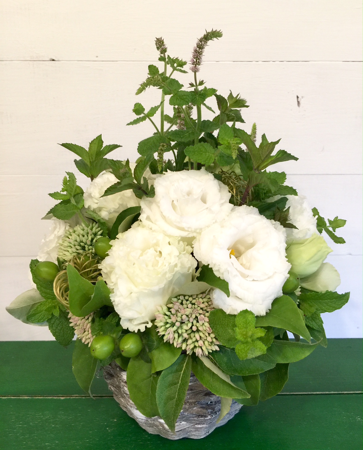 美流渡のミントをたっぷり使って作ったアレンジメント。ヒペリカムとクレマチスの実、セダムを合わせて爽やかなイメージに仕上げました。(y)