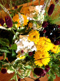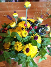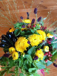 夏の名残と秋の気配が織り交ぜられたアレンジメント。美流渡のミントは花の季節到来です。(y)
