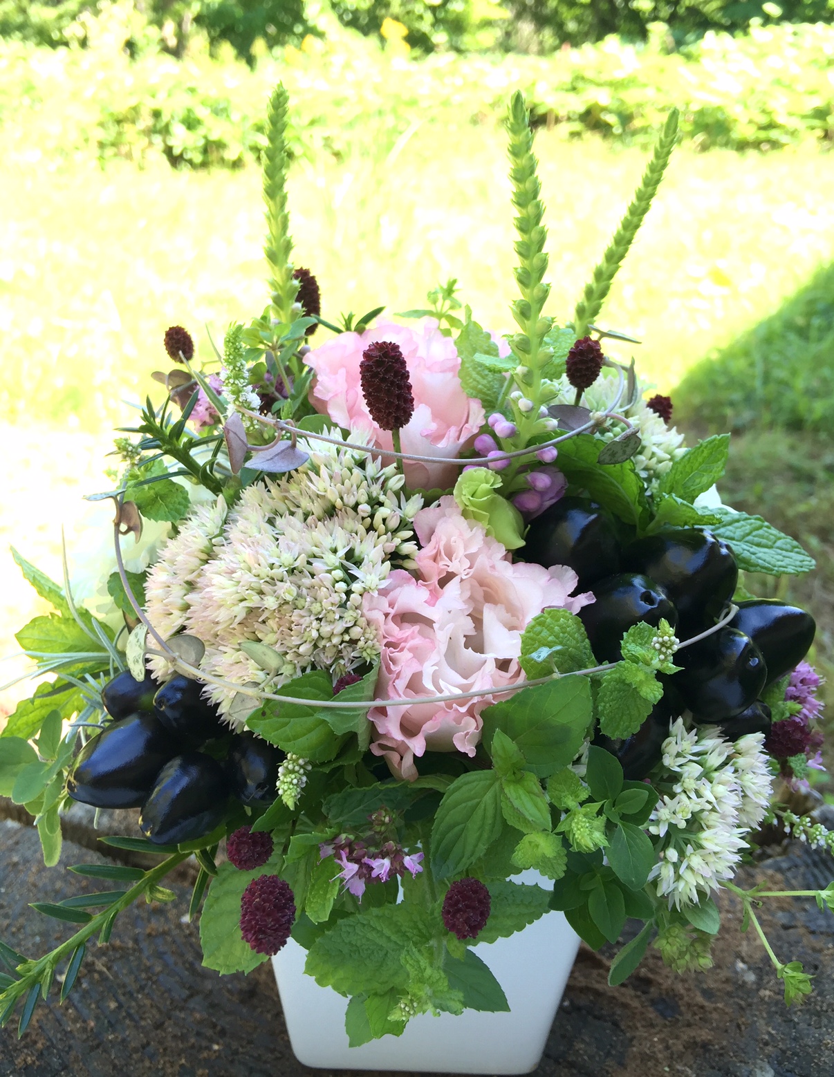 グリーンは花の付いたミント各種。ガーデンからのお花はカクトラノオ。黒いトウガラシはぼやけたピンクをグッと引き締めて。(m)