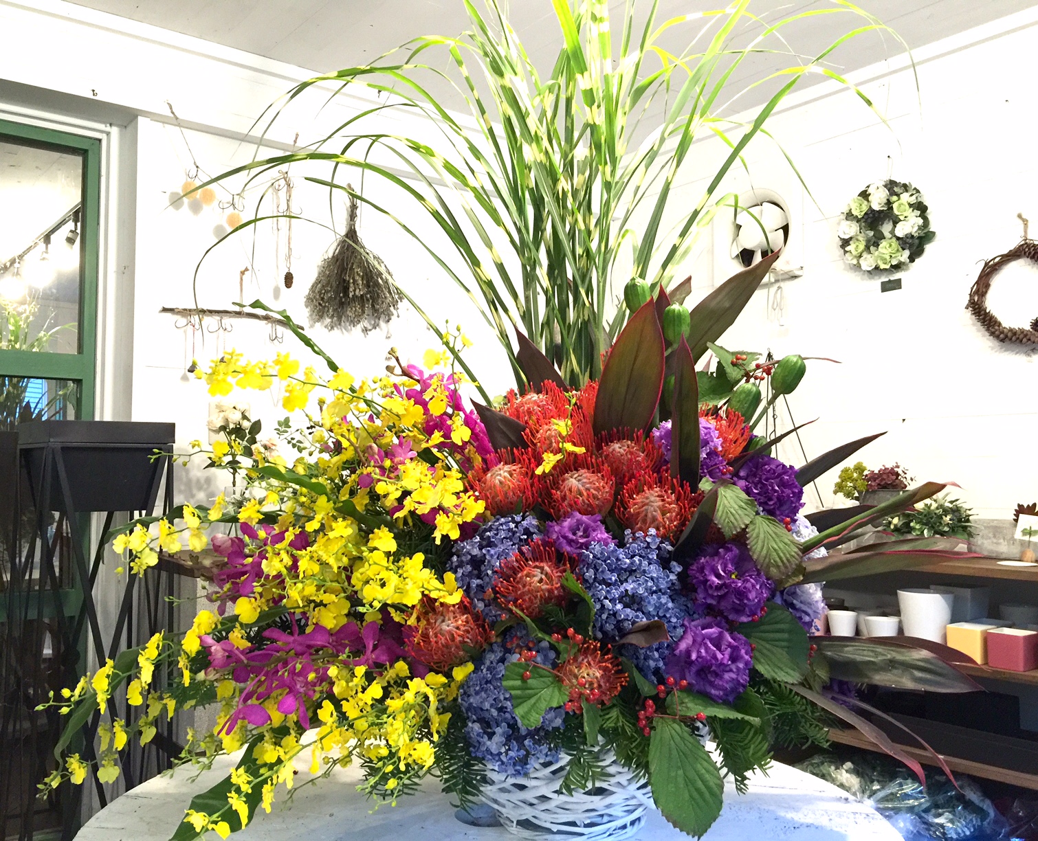 ピンクッションとオンシジュームを使って華やかに。(m)