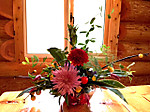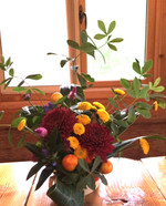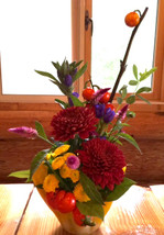各自持参の器を使って和洋折衷のアレンジメントを作りました。洋菊と花ナス、スプレーマム、リンドウを組み合わせて秋の到来です。(y)